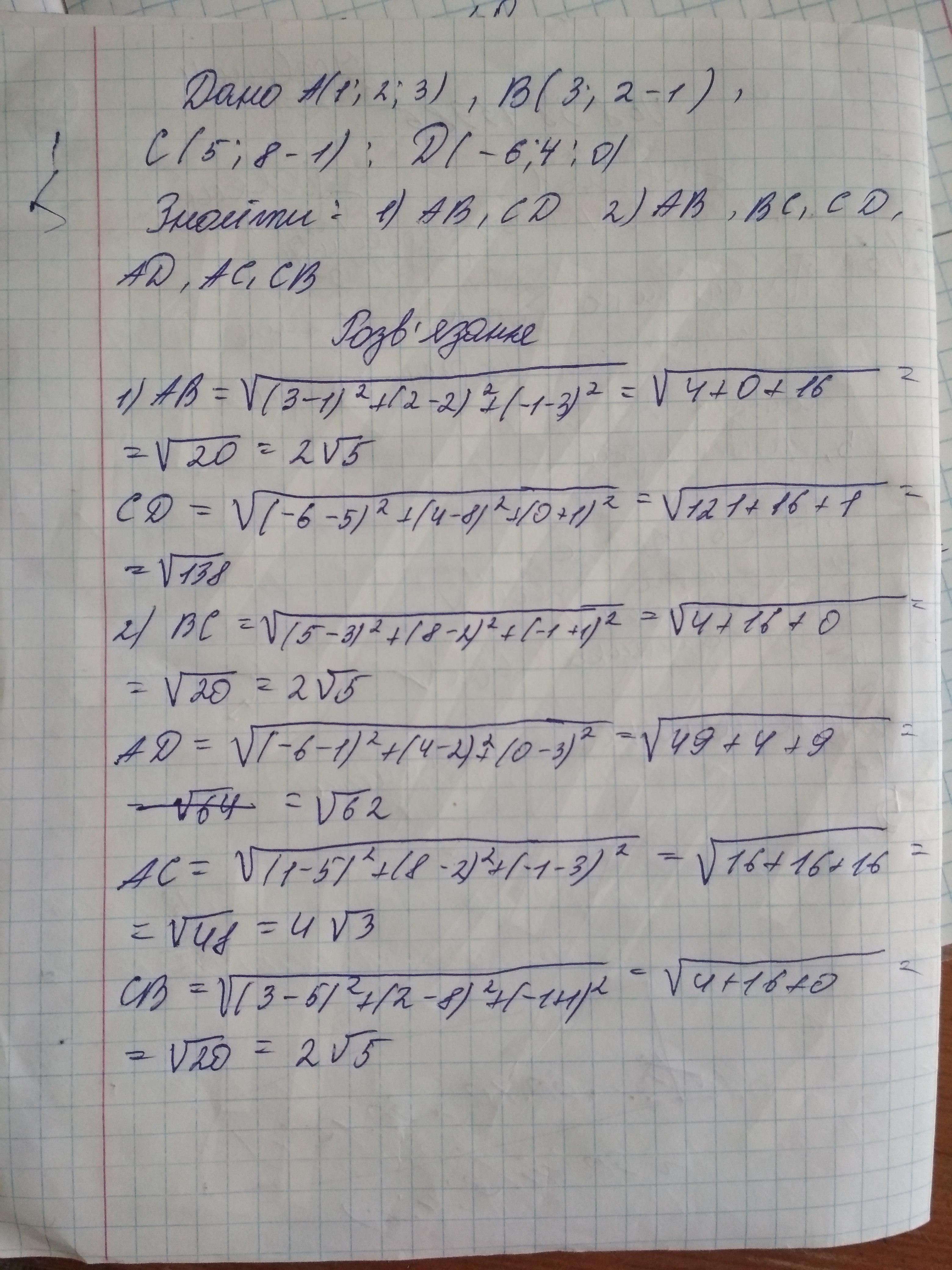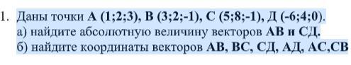 Даны точки А (1;2;3), В (3;2;-1), С (5;8;-1), Д (-6;4;0).
