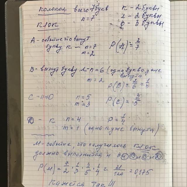 Из карточек с буквами составлено слово «колокол». Карточки перемешиваются, из них случайным образом отбирают 4 и выкладываются в ряд. Какова вероятность того, что они образуют слово «клок»?