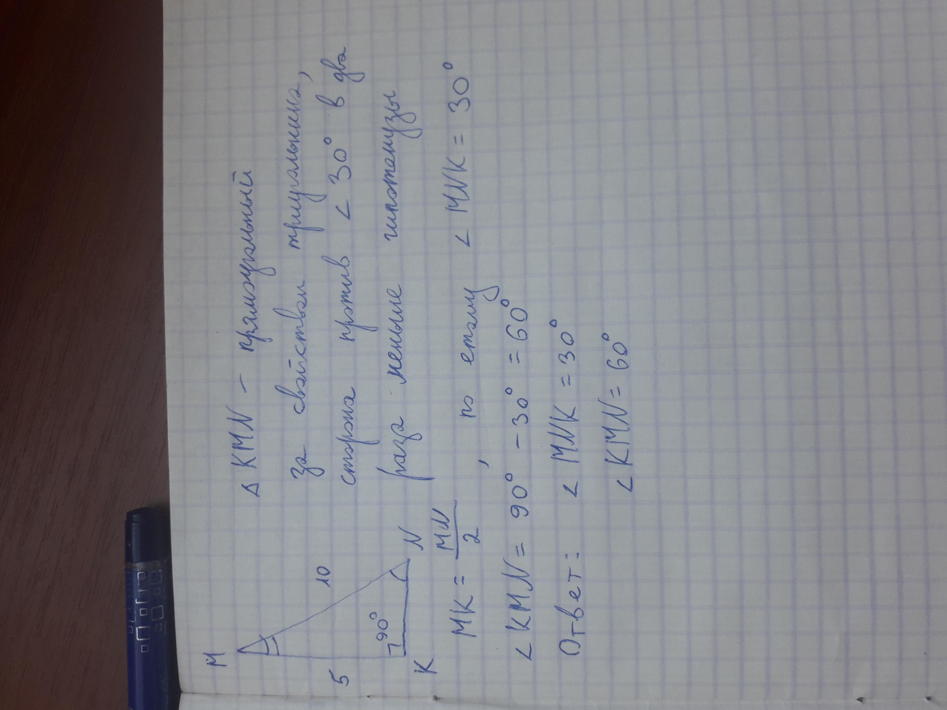 Против кута 30 градусов лежит сторона, которая в два раза меньше за гипотенузу, по етому кут MNK = 30, кут KMN = 60