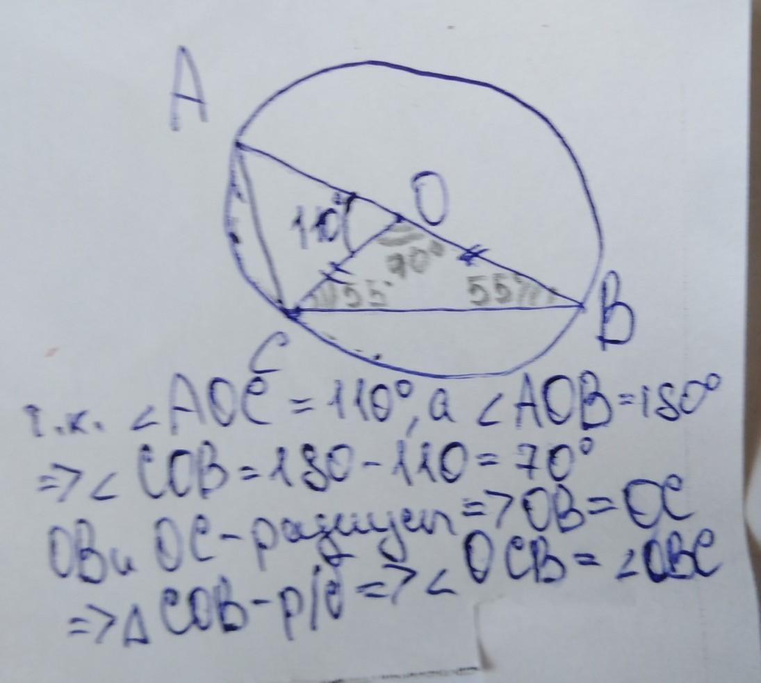 В окружности сцентром в точке О проведены диаметр АВ и хорда ВС, Найти углы треугольника ВОС, если угол АОС равен 110 градусов.