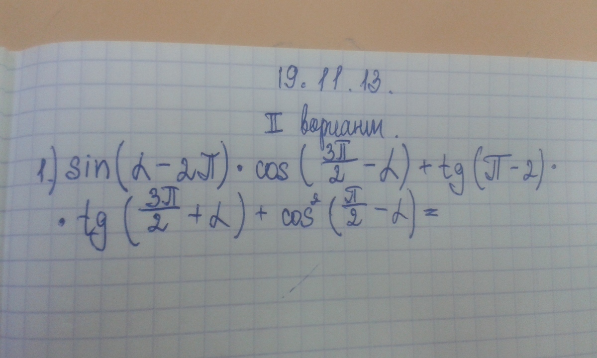 sin( alpha -2 pi )cdot cos(frac{3 pi}{2}- alpha)+tg( pi - alpha )cdot tg(frac{3 pi}{2}+alpha)+cos^2(frac{pi}{2}- alpha)=\ =-sin(2 pi-alpha)cdot(-sin alpha )+(-tg alpha)cdot (-ctg alpha )+sin^2 alpha =\ =sin alphacdot(-sin alpha)+1+sin^2 alpha=-sin^2 alpha+1+sin^2alpha=1
