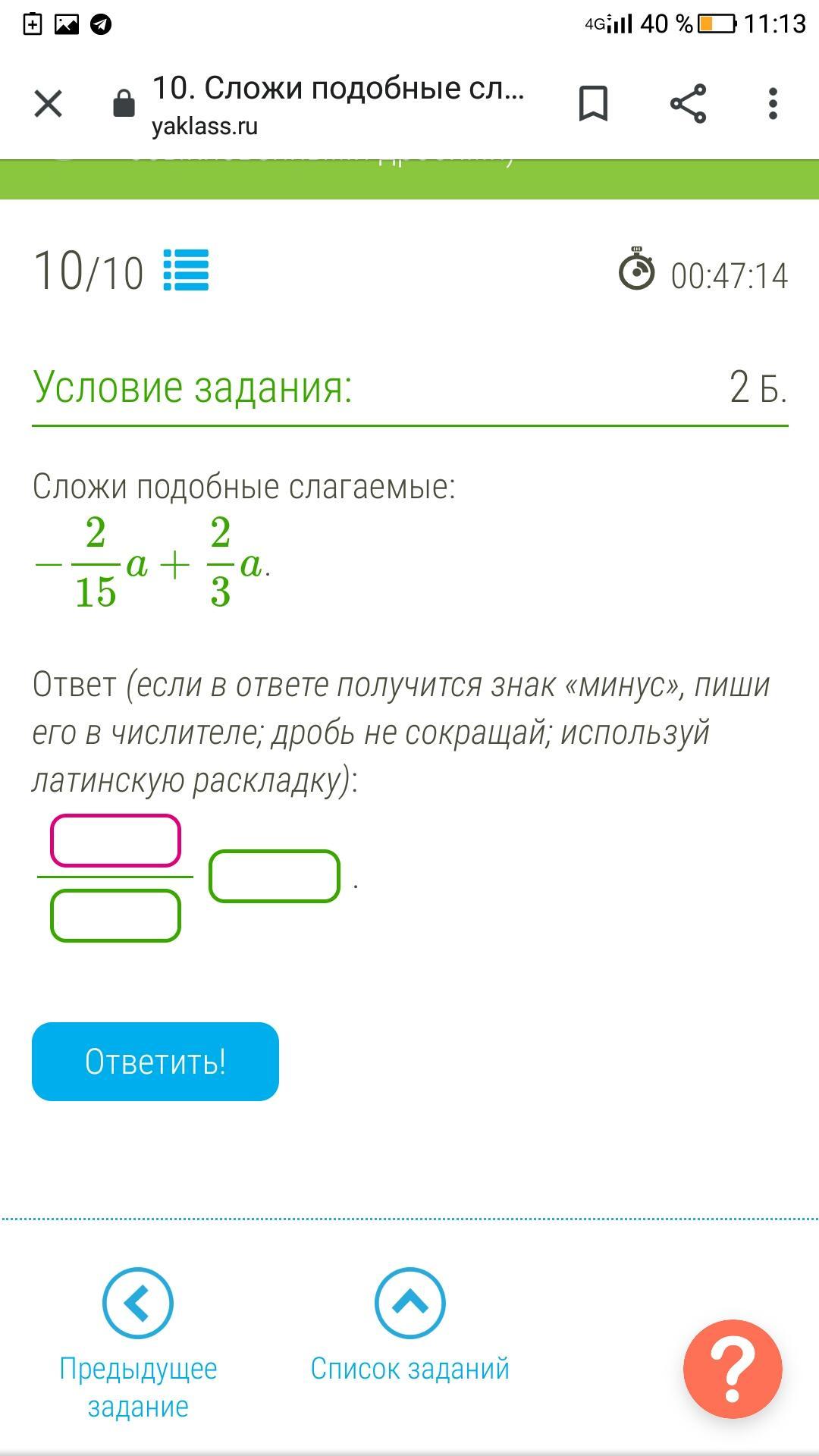 - 2/15 а + 2/3 а = - 2/15 а + 10/15 а =