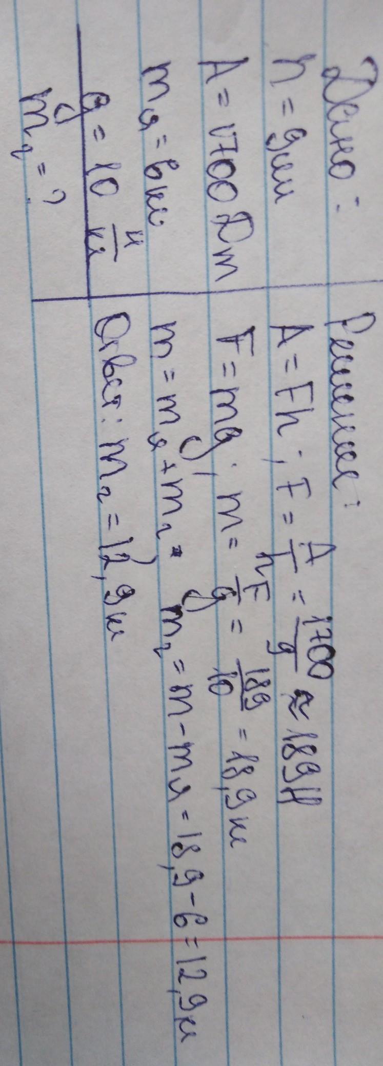 При подъёме ящика с гвоздями на высоту 9 м, выполнена работа в 1700 Дж. Вычисли массу гвоздей, если известно, что масса ящика равна 6 кг.