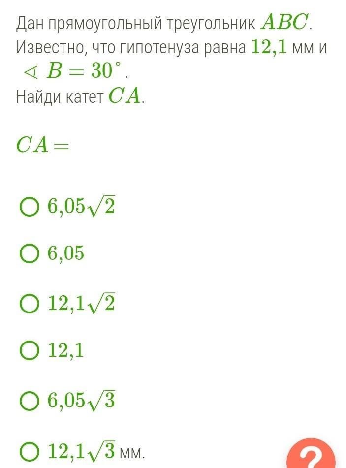 Катет СА находится после угла в 30°. Из теории нам известно что катет против 30 равен половине гипотенузы. Делим 12,1 на 2,и получаем 6,05