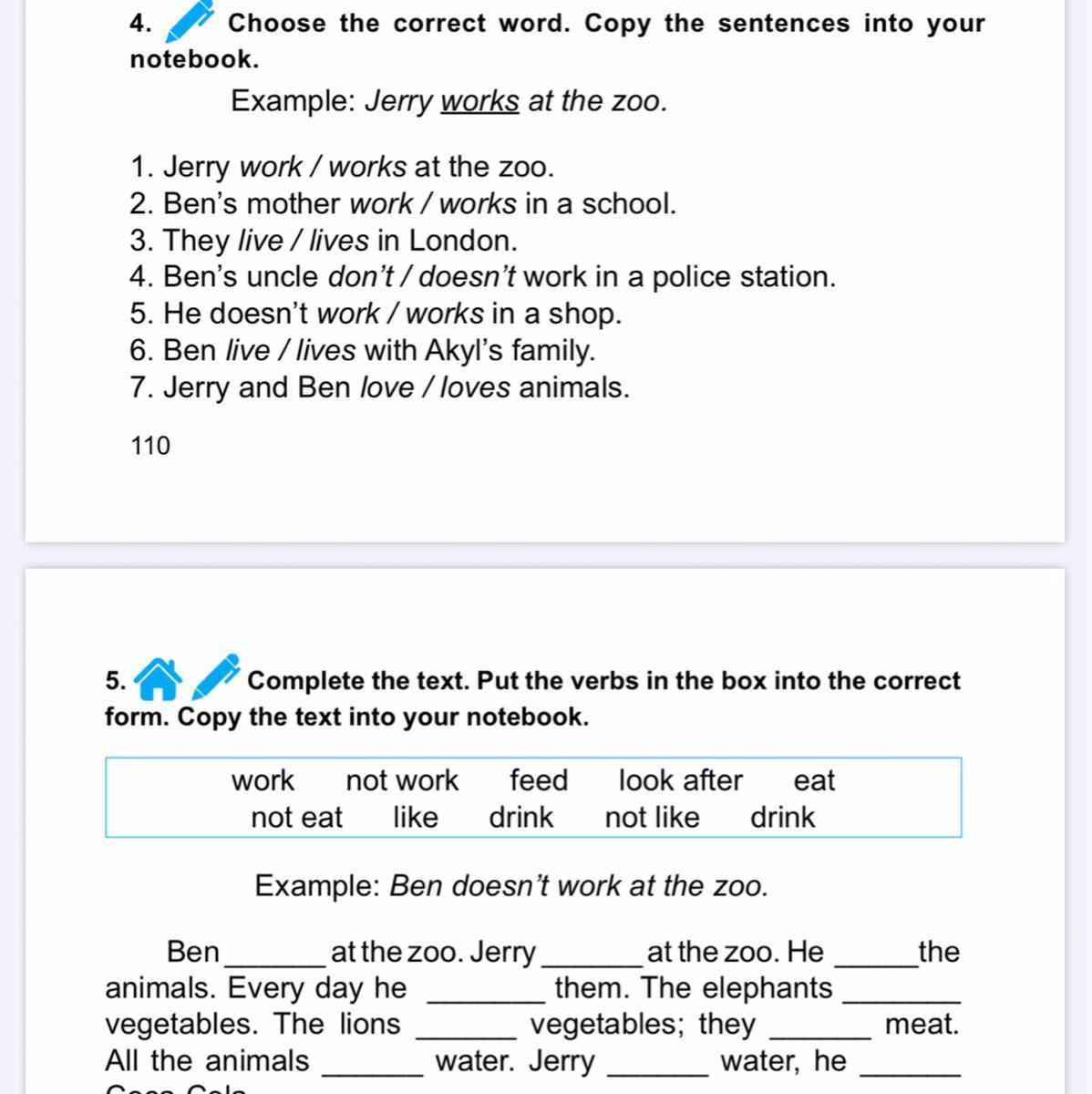 5.Ben works at the zoo.Jerry doesn't work at the zoo.He look after animals.Every day he feed them.The elephants like vegetables .The lions don't eat vegetables; they eat meat.All animals drink water, he doesn't like........
