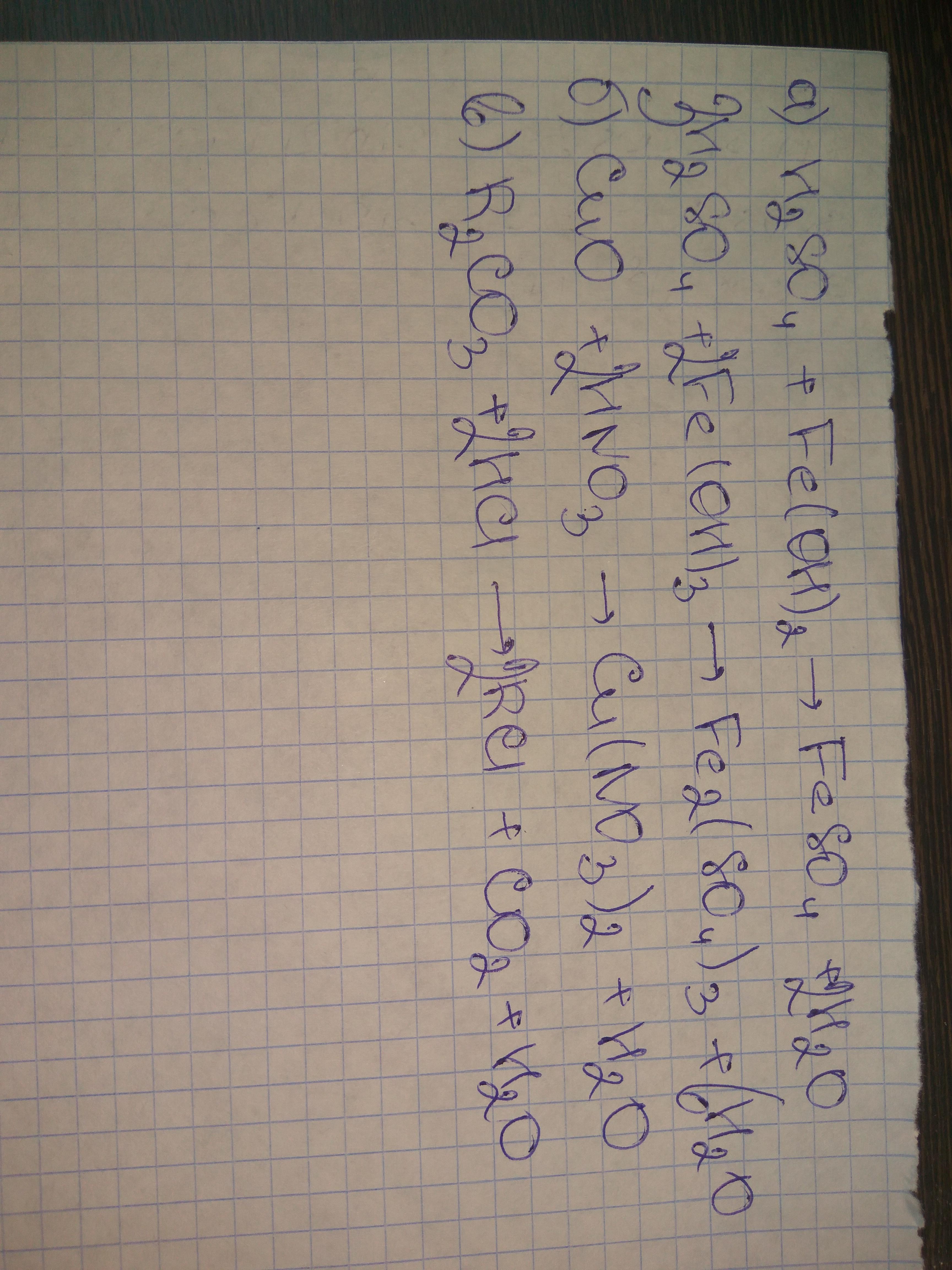 НАПИШИ УРАВНЕНИЯ :А)СЕРНАЯ К-ТА+ГИДРОКСИД ЖЕЛЕЗА= Б)ОКСИД МЕДИ +АЗОТНАЯ К-ТА =В)КАРБОНАТ КАЛИЯ + СОЛЯНАЯ К-ТА=