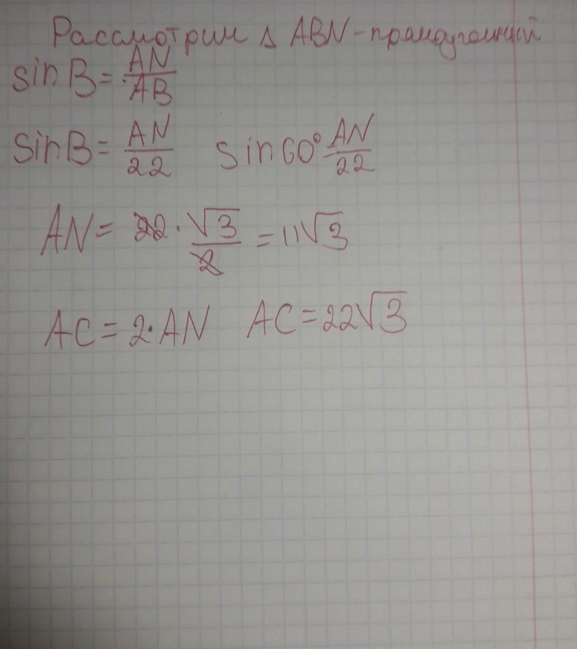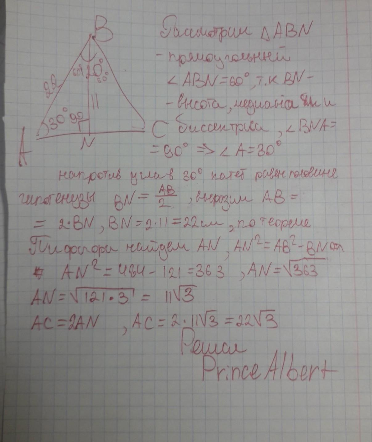 1.В равнобедренном треугольнике АВС с основанием АС угол В равен 120°. Найдите АС, если высота, проведённая к боковой стороне треугольника, равна 11 см.