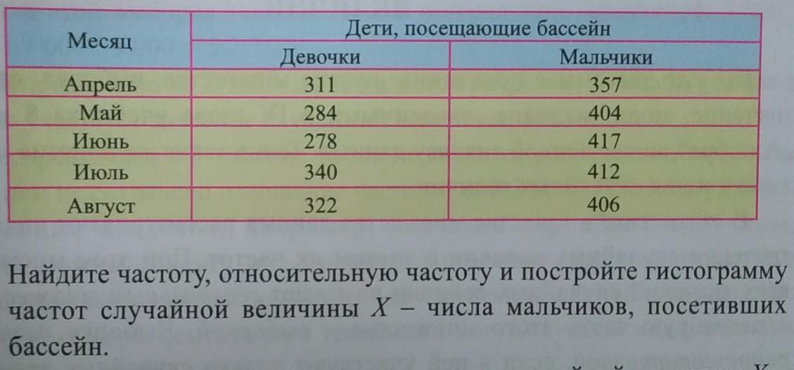 Ниже представлена таблица числа девочек и мальчиков посетивших закрытый бассейн за 5 месяцев: