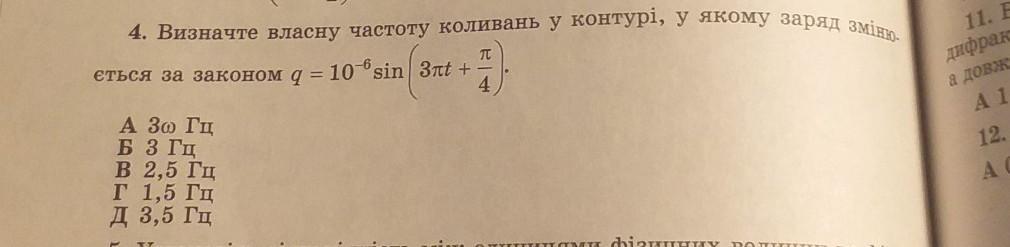 Визначте власну частоту коливань у контурі, у якому заряд змінюється за законом q= 10^-6sin(3Пt+П/4)