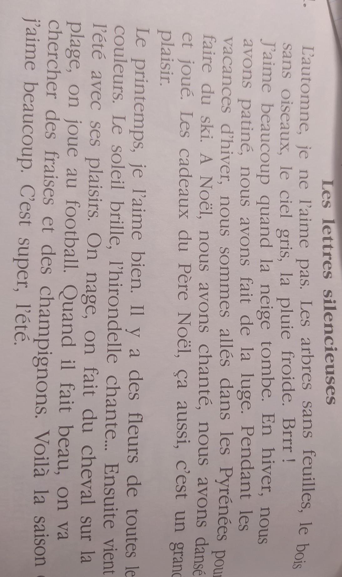 Мне очень нравится весна. Весной можно увидеть самые разные цветы (букв. Там есть цветы всех цветов). Светит солнышко, поёт ласточка... А потом наступает лето со всеми его прелестями. Мы плаваем, едем верхом (катаемся на лошади) по пляжу, играем в футбол. Когда погода хорошая, мы идём искать землянику (клубнику) и грибы. Вот время года, которое я очень люблю. Лето - это здорово (Как же это здорово, лето!).