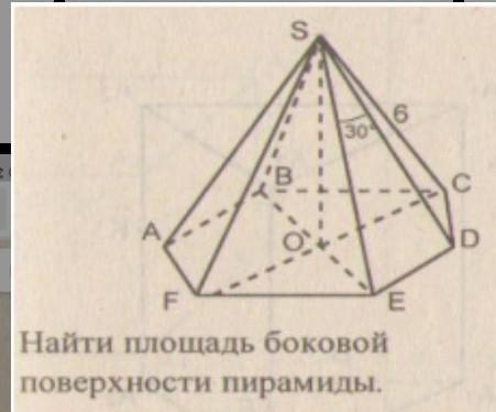 Боковая поверхность этой правильной пирамиды состоит из шести равнобедренных треугольников с сторонами равными 6 и углом при вершине равным 30°. Площадь одного такого треугольника найдем по формуле полупроизведения сторон на синус угла между ними.