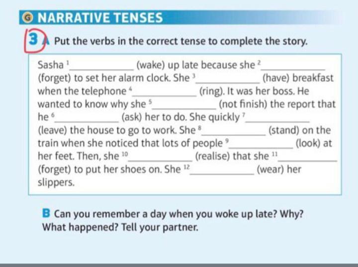 1 woke 2 had forgotten 3was having 4 rang 5 hadn't finished 6 had asked 7 left 8 was standing 9 were looking 10 realized 11 had forgotten 12 was wearing