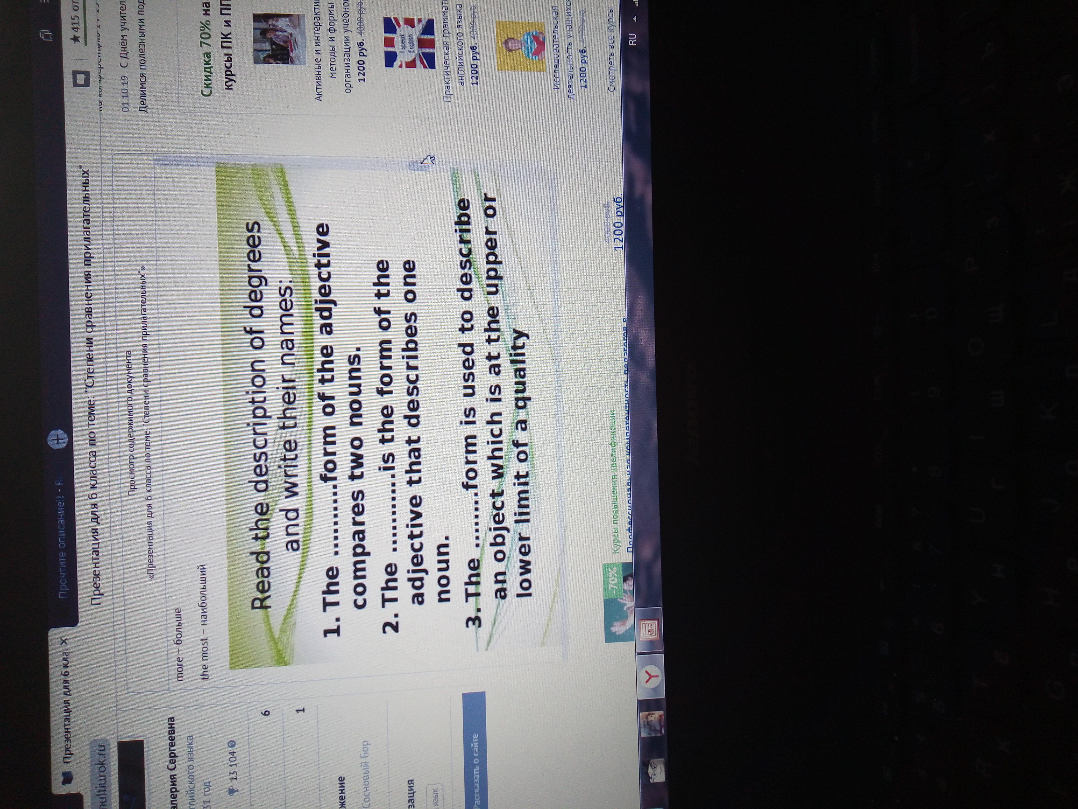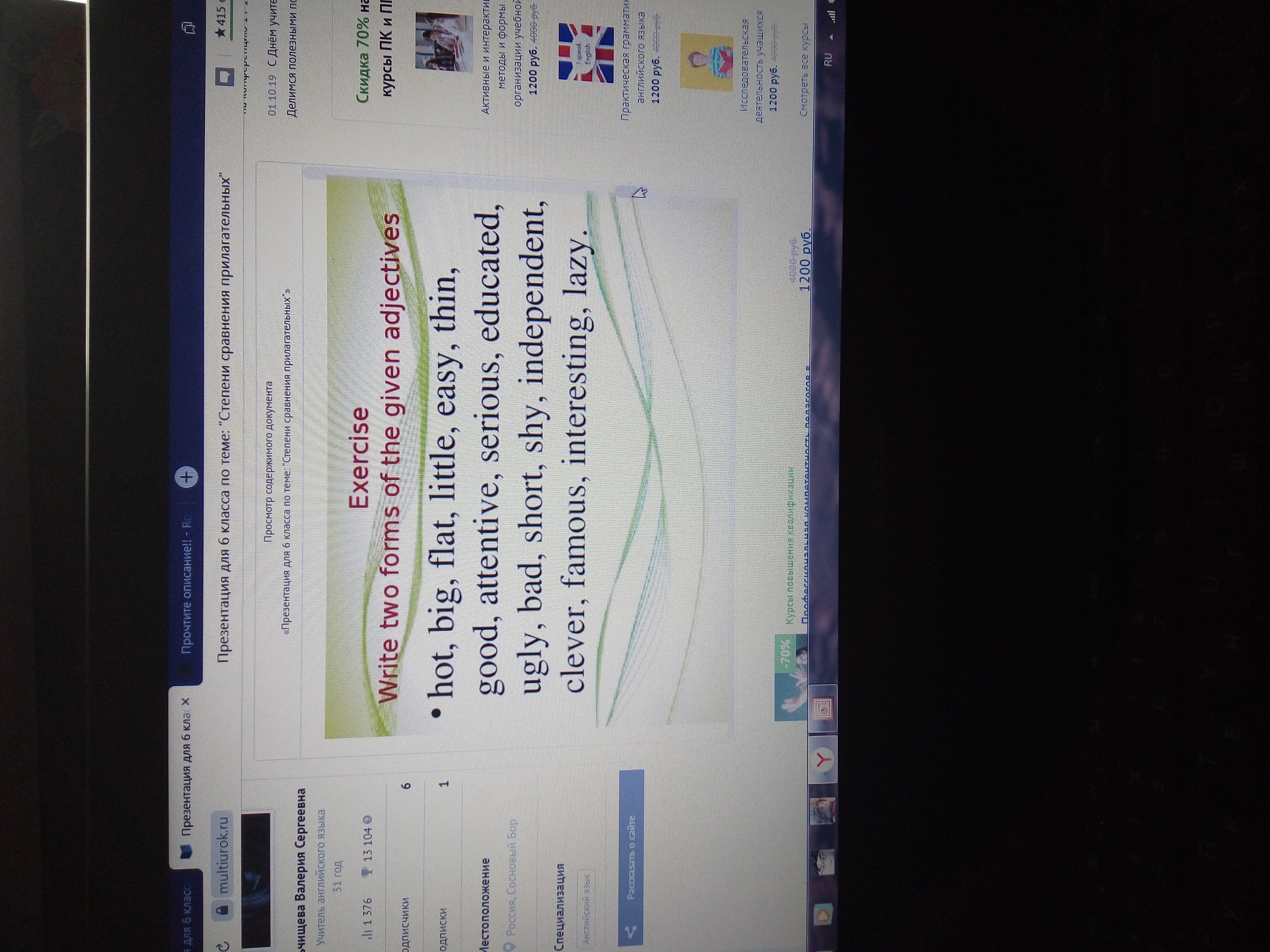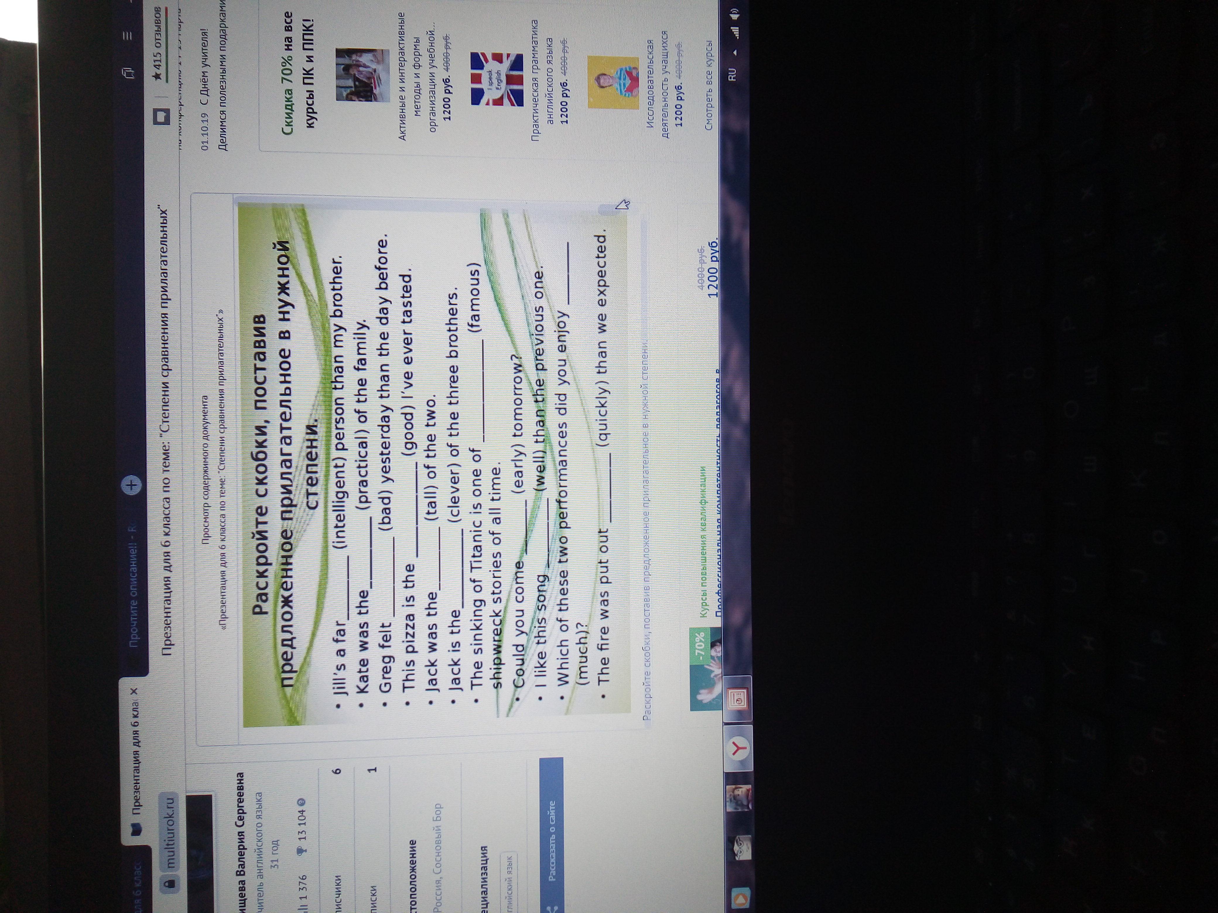 Jill’s a far__more__ (intelligent) person than my brother. Kate was the__most__ (practical) of the family. Greg felt (worse) yesterday than the day before. This wine is the (best) I’ve ever tasted. Jack was the (taller) of the two. Jack is the (cleverest) of the three brothers. If you need any (further) information, please contact our head office. The sinking of Titanic is one of most (famous) shipwreck stories of all time. Please, send the books back without (further) delay. The deposits of oil in Russia are by far the (richest) in the world. Could you come a bit (earlier) tomorrow? I like this song (better) than the previous one. Which of these two performances did you enjoy (more)? The fire was put out (quicker) than we expected.