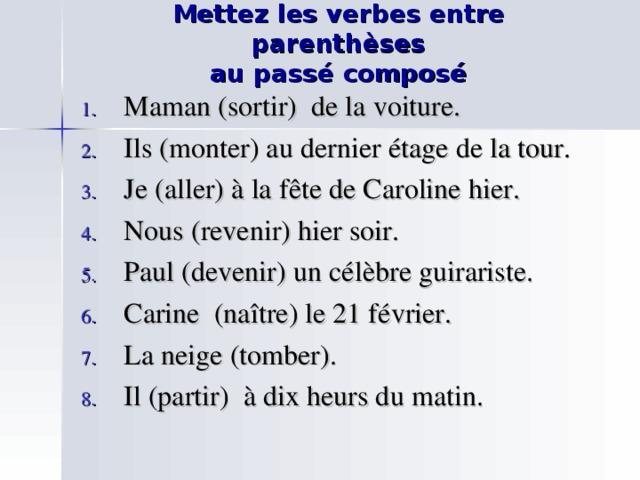1 est sortie 2 sont montés 3 suis allé 4 sommes revenus 5 est devenu 6 est née 7 est tombée 8 est parti