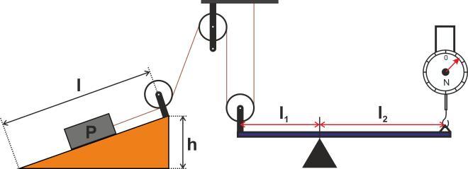 Какой величины потребуется сила F для перемещения груза, вес которого P=162Н, если высота наклонной плоскости h=0,3 м, длина наклонной плоскости l=1,8 м, плечи рычага l1=1,1 м и l2=3,3 м?