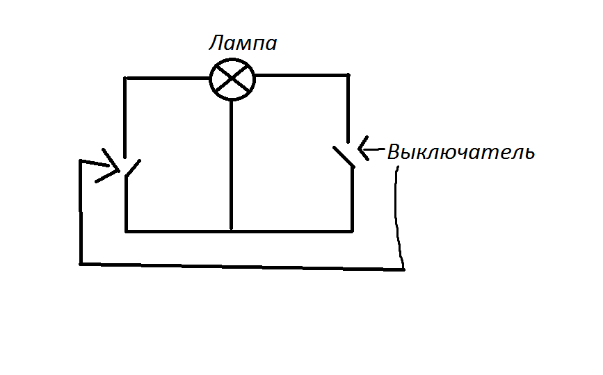 Длинный коридор, лишенный окон, освещается электрической лампой. Ее можно зажечь и погасить выключателем, установленным у входной двери. Это неудобно выходящему на улицу, поскольку до выхода он вынужден добираться в темноте. Впрочем, вошедший и включивший при входе лампу тоже недоволен: пройдя коридор, он оставляет лампу, которая будет гореть напрасно. А нельзя ли придумать схему, которая позволяла бы включать и выключать лампу из разных концов коридора?Представить схему