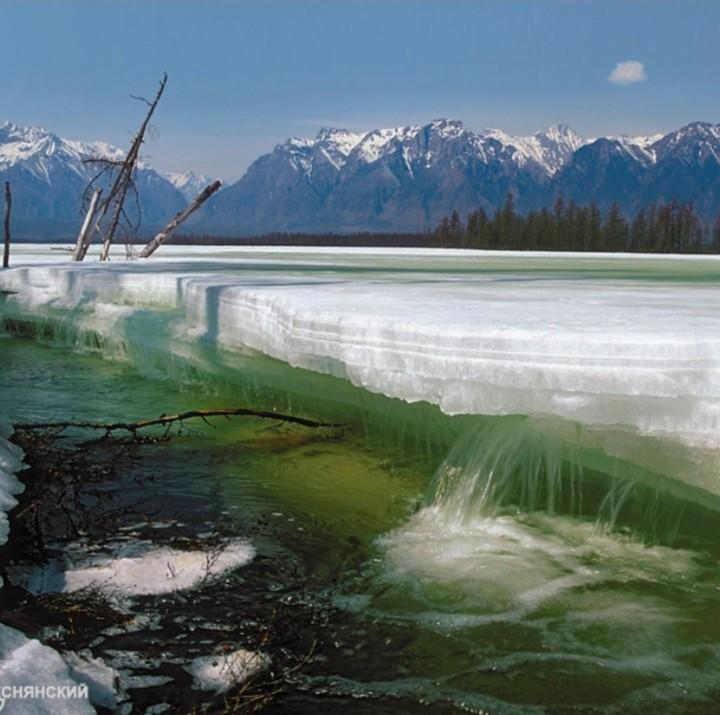 Вда выступившая поверх льда,а также корка льда на этой воде.