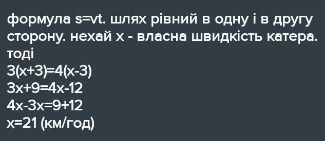 7. Від пристані А до пристані В за течією річки катер плив 3 год, а від В до А – 4 год. Знайдіть швидкість катера у стоячій воді, якщо швидкість течії річки дорівнює 3 км/год.