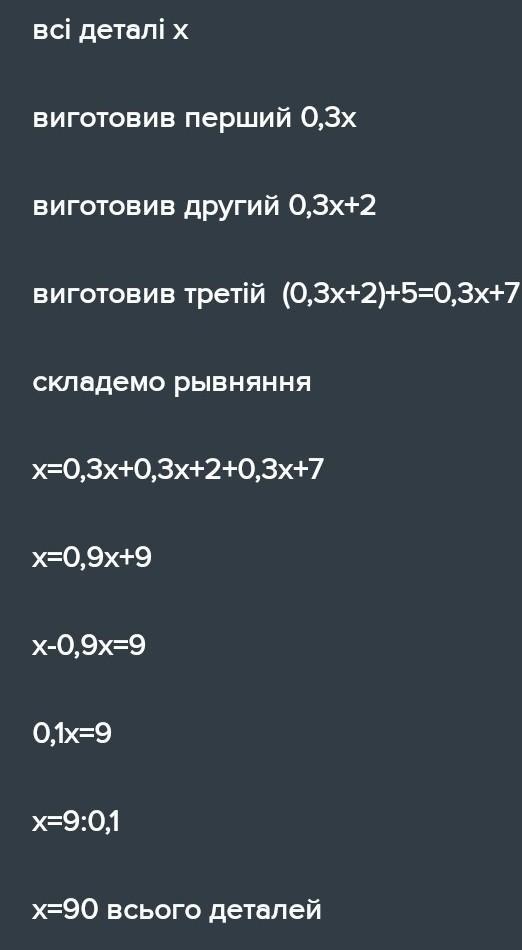 9. За зміну 3 робітники виготовили партію деталей. Перший робітник виготовив 30% усіх деталей, другий – на 5 деталей менше, ніж третій, і на 2 деталі більше, ніж перший. Скільки всього деталей виготовили робітники?