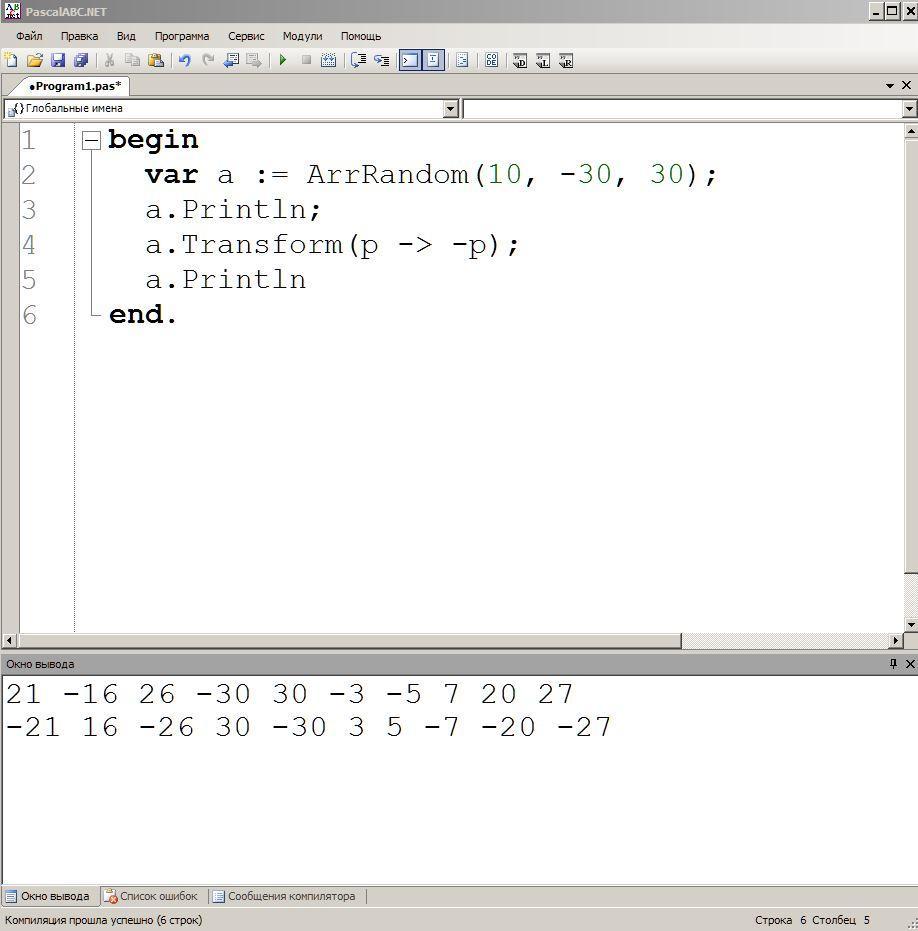 Паскаль.Заполните массив 15 числами от -30 до 30. Замените все элементы массива на противоположные по знаку. Вывести на экран первый и второй массив.