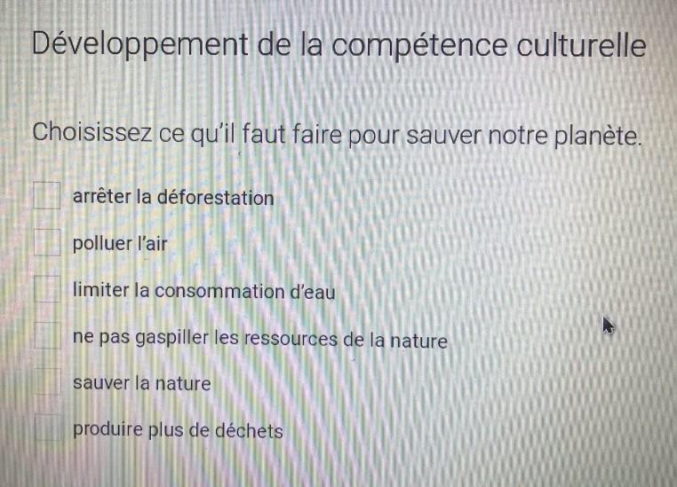Ответ: Arreter la deforestation, limiter la consommation de l'eau, ne pas gaspiller les ressources de la nature, sauver la nature.