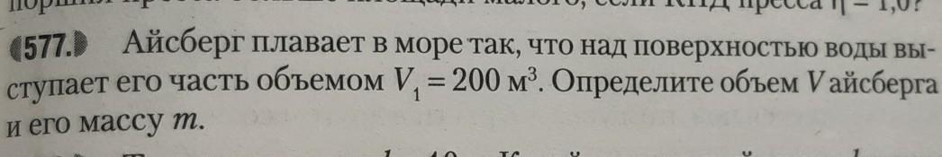 Айсберг плавает в море, так что над поверхностью воды выступает его часть объемом V1=200 м кубических. определите объем V айсберга его массу m.