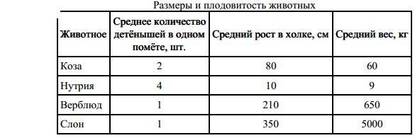 Используя таблицу «Размеры и плодовитость животных», ответьте на вопросы.