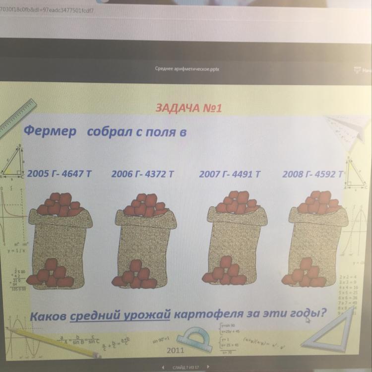 т.к у нас всего 4 года и за каждый год разное кол-во урожая, то надо сложить весь картофель за все года и поделить на кол-во лет (в нашем случае 4)