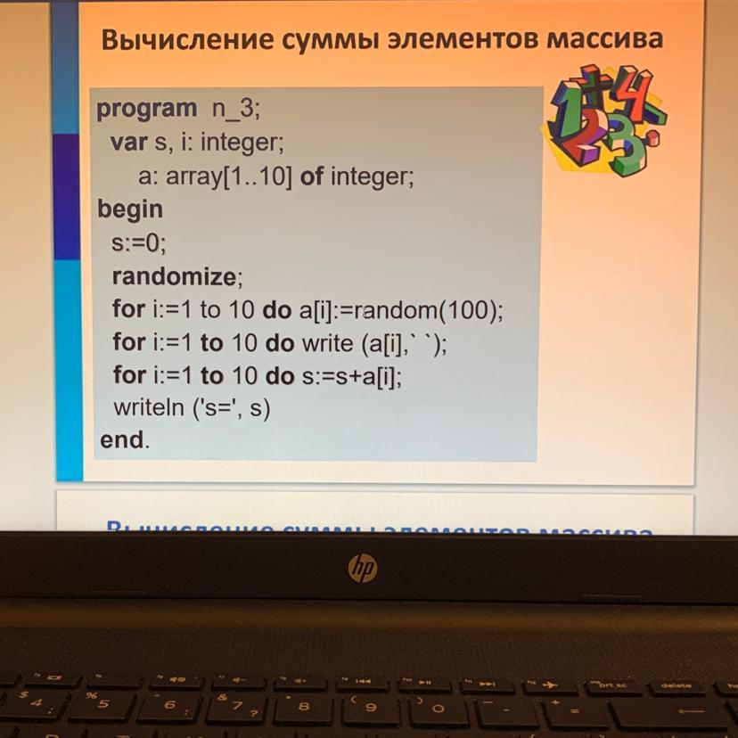 По такому примеру выполните следующее задание: Дан массив А, содержащий последовательность чисел: 0,5; 12; -18; 16; 13; 5; 8; 0 . Найти сумму элементов массива.Желательно распишите.