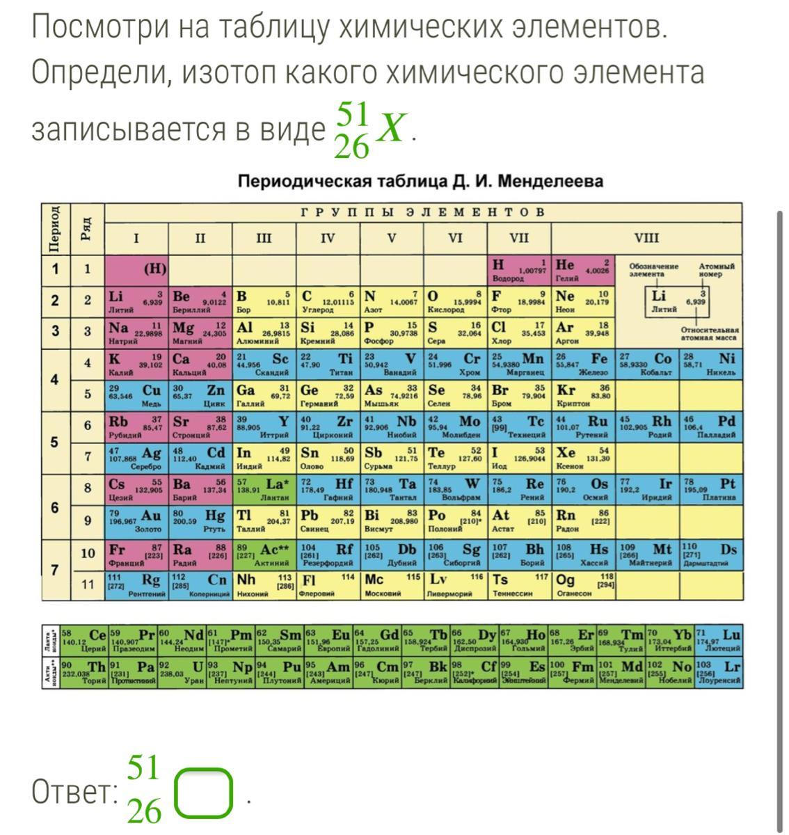 Посмотри на таблицу химических элементов. Определи, изотоп какого химического элемента записывается в виде 51/26.