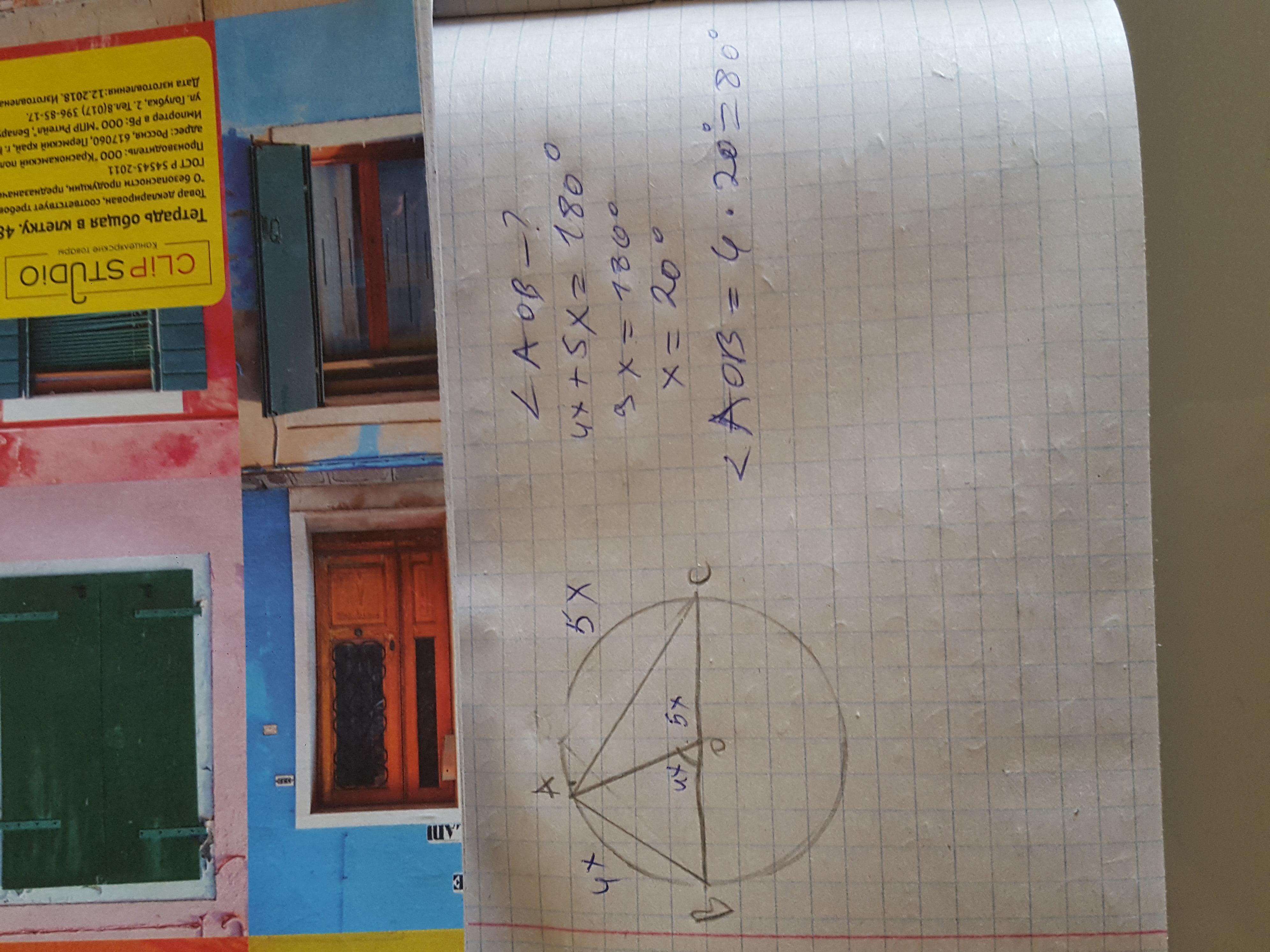Дана окружность с центром в точке O. Диаметр окружности BC и хорда CA расположены так, что градусные меры дуг AB и AC относятся как 4 к 5. Найдите угол AOB. Ответ дайте в градусах.