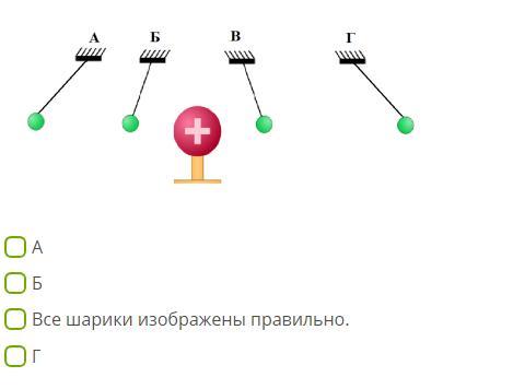 Если взаимодействие заряженного шарика В принять за правильное, то можно сделать вывод, что шарики имеют положительный заряд (т.к. отталкиваются от большого шара). Так как по закону Кулона сила, действующая на заряженные тела ОБРАТНО ПРОПОРЦИОНАЛЬНА расстоянию между ними, шарики А и Г изображены неверно. Они должны быть отклонены на меньший угол с вертикалью чем шарики В и Б.
