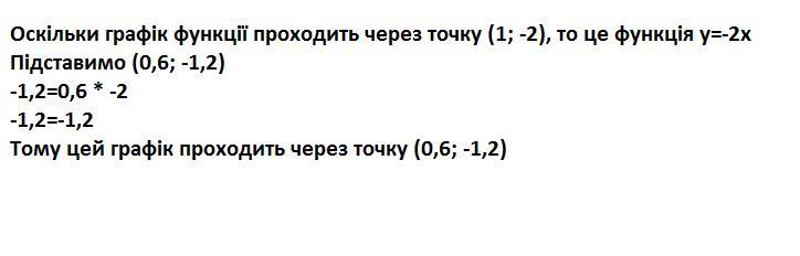 графік прямої пропорційності проходить через точку (1;-2) чи проходить цей графік через точку (0,6;-1,2)
