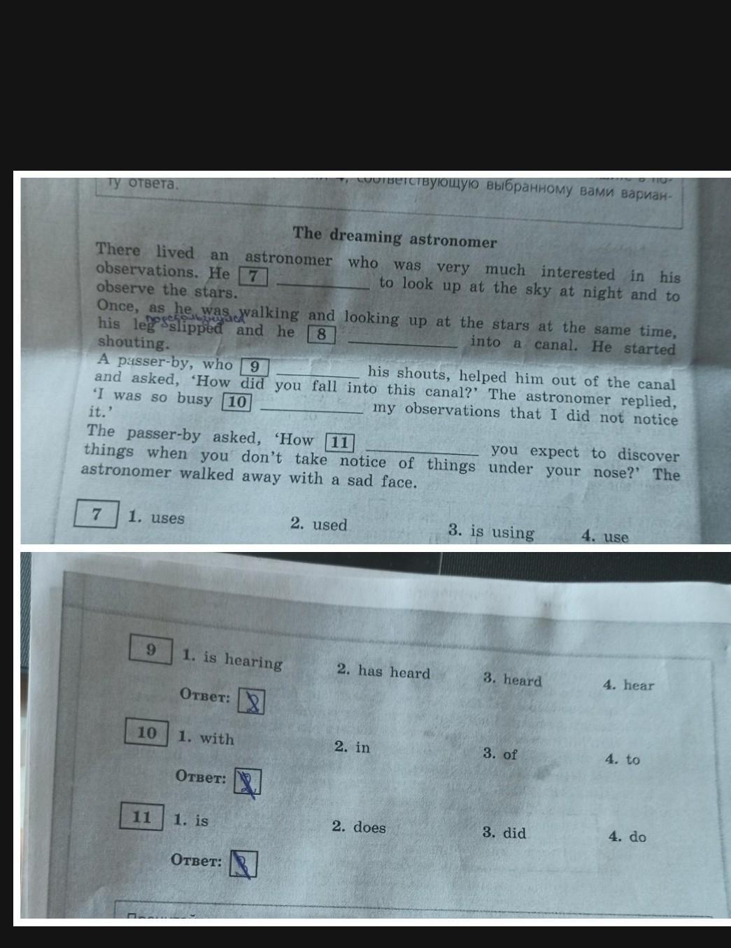 There lived an astronomer who was very much interested in his observations. He 7 2. used to look up at the sky at night and to observe the stars. Once, as he was walking and looking up at the stars at the same time, his leg slipped and he [8 fell into a canal. He started shouting. A passer-by, who 9 3. heard his shouts, helped him out of the canal and asked, 'How did you fall into this canal? The astronomer replied, was so busy [10] 1. with my observations that I did not notice it. The passer-by asked, 'How [11] 3. did you expect to discover things when you don't take notice of things under your nose?' The astronomer walked away with a sad face.
