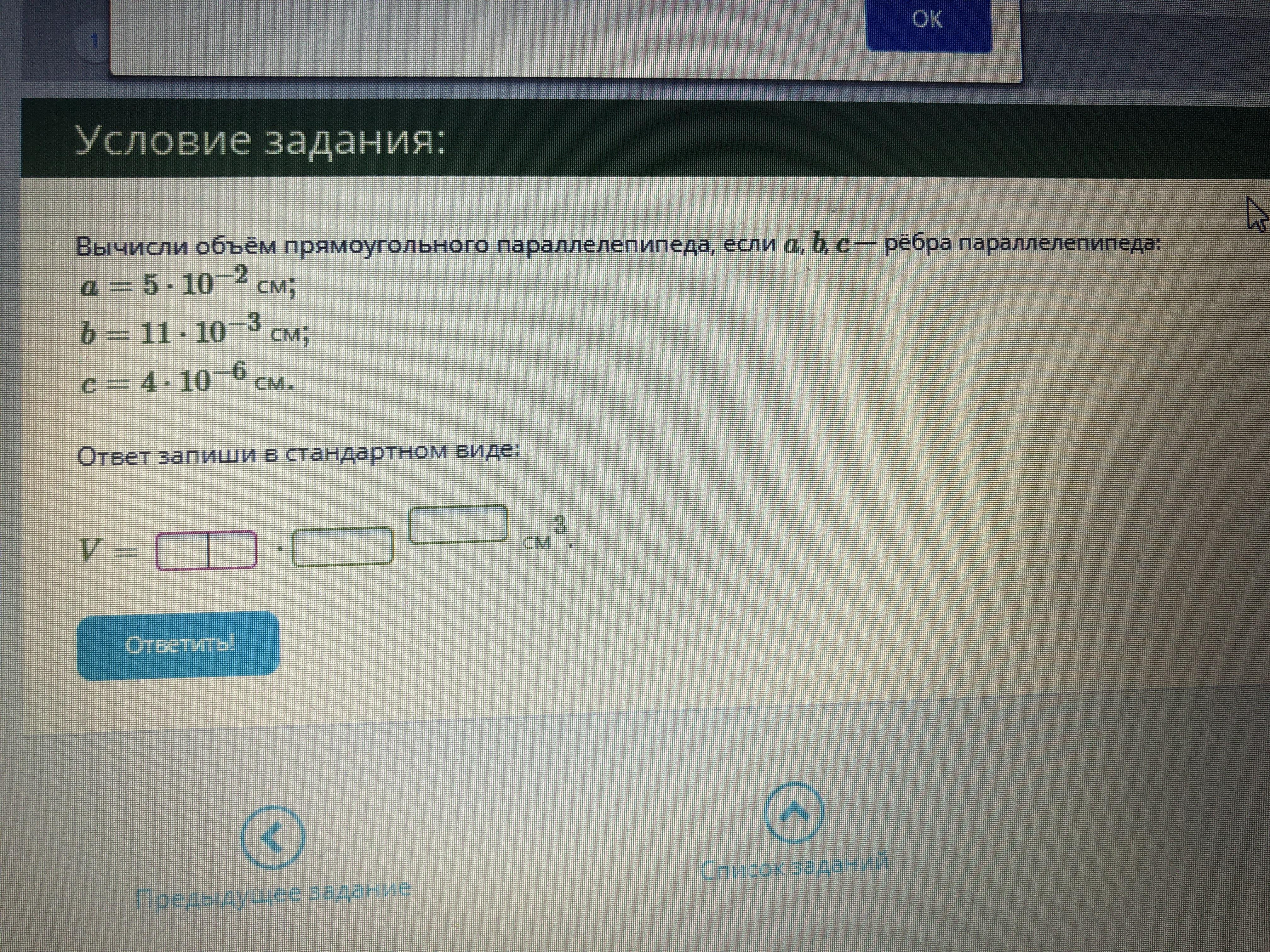Объяснение:V=a*b*c = 5*11*4*10^(-2-3-6) = 220 * 10^-11 = 2.2 * 10^-9