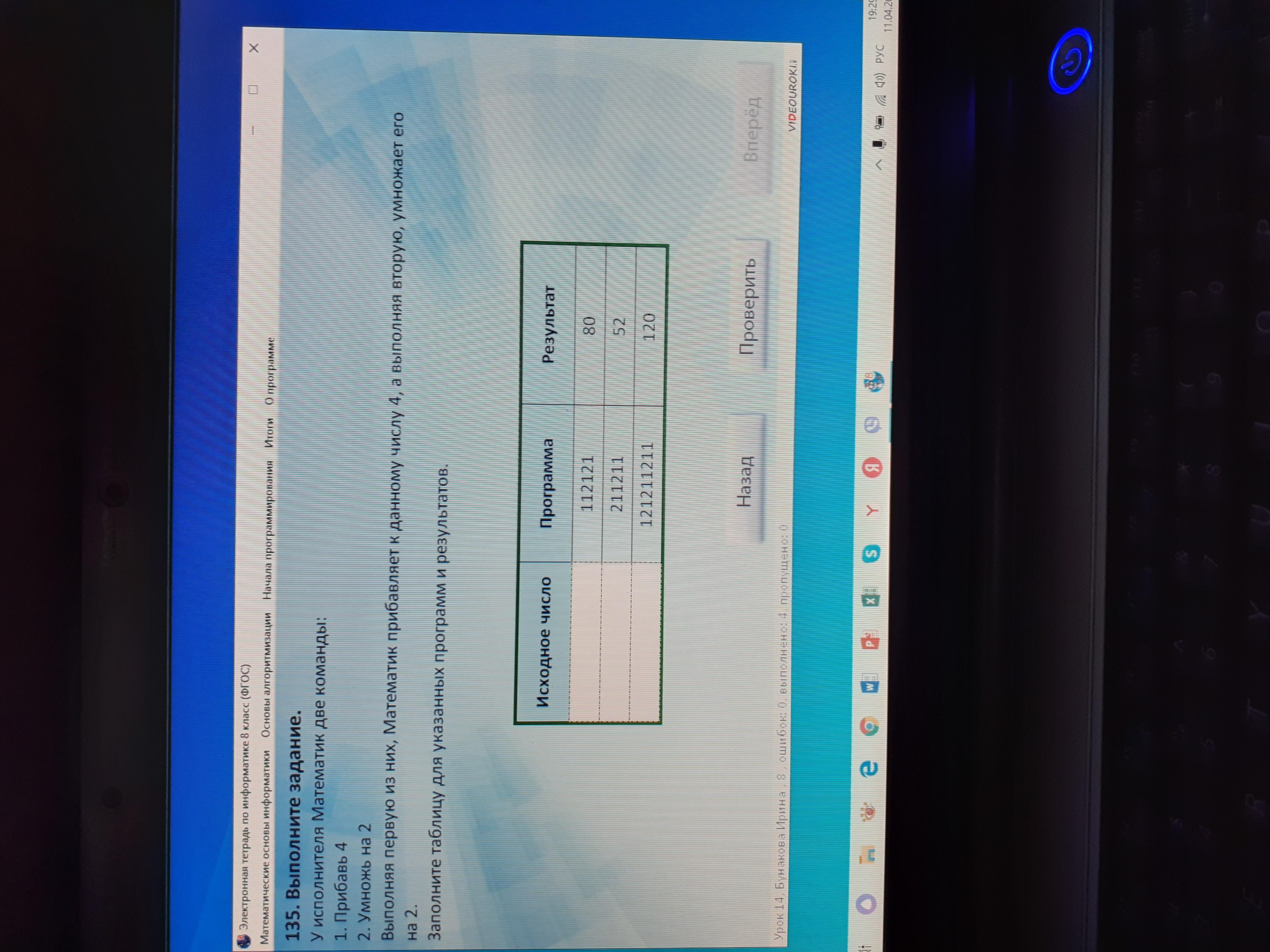 Выполняя первую из них математик добавляет к данному числу 4, а выполняя вторую, умножает его на 2. Заполните таблицу для указанных программ и результатов