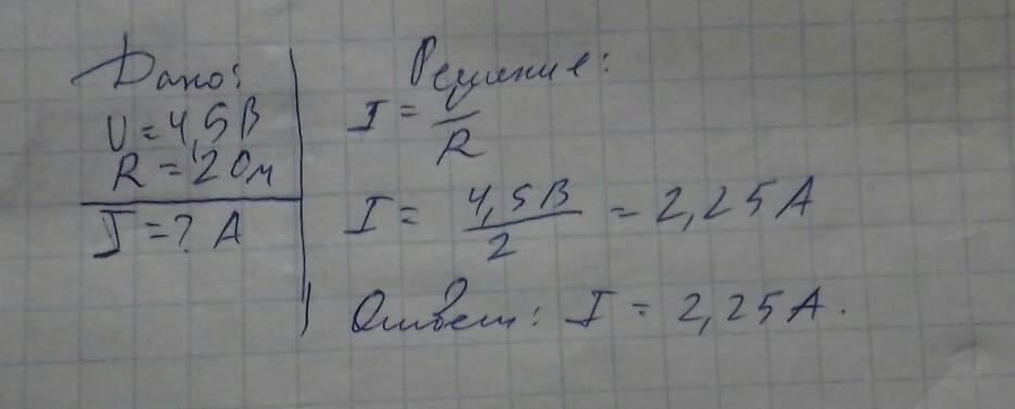 Знайдіть силу струму, якщо через резистор в 2 Ом, пропустили електричну напругу в 4,5 В.