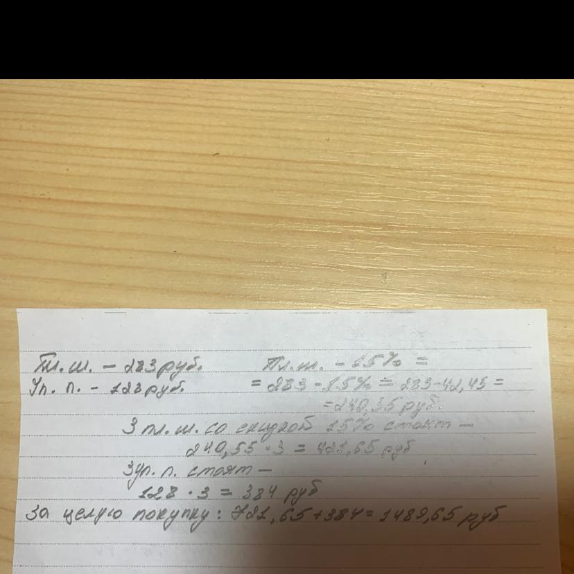 Плитка шоколада стоит 283 руб., упаковка печенья стоит 128 руб. На шоколад в магазине действует скидка 15%. Какую сумму заплатит покупатель за 3 плитки (плиток) шоколада и 3 пачки (пачек) печенья? (Ответ округли до сотых).