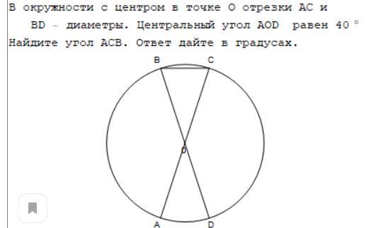 Диаметры AC и BD пересекаются в точке О - центре окружности, и образуют вертикальные углы <AOD и <BOC. Известно, что вертикальные углы равны, следовательно <AOD = <BOC =40°.