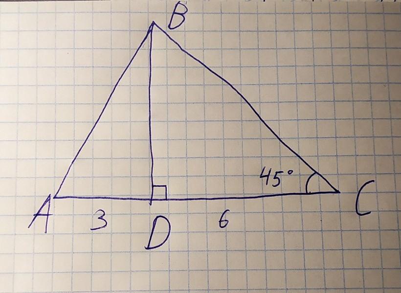 =>угол DBC = 180 - 90 - 45 = 45 => угол DBC = углу C => треугольник BDC - равнобедренный => BD = DC = 6см