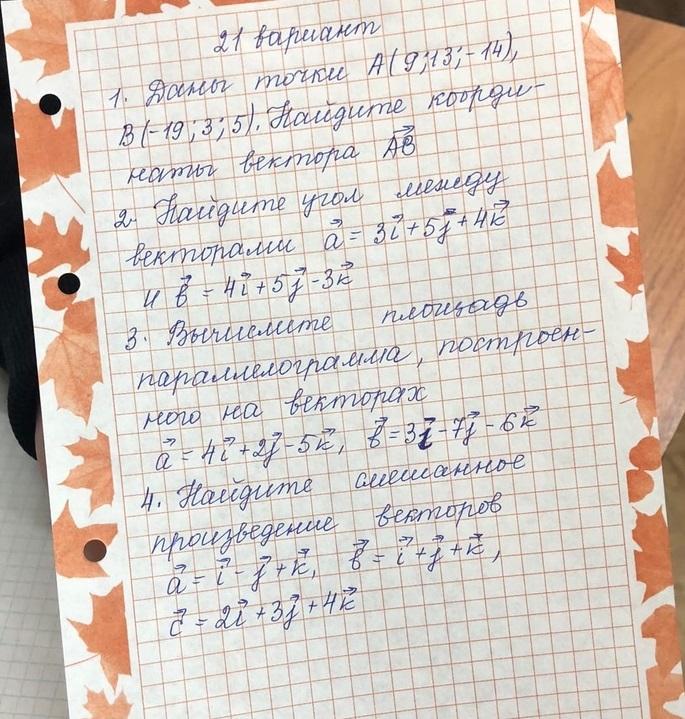 cos(фи)=(3*4+5*5+4*(-3) ) /V50 * V50=25/50=1/2, угол (фи)=60"