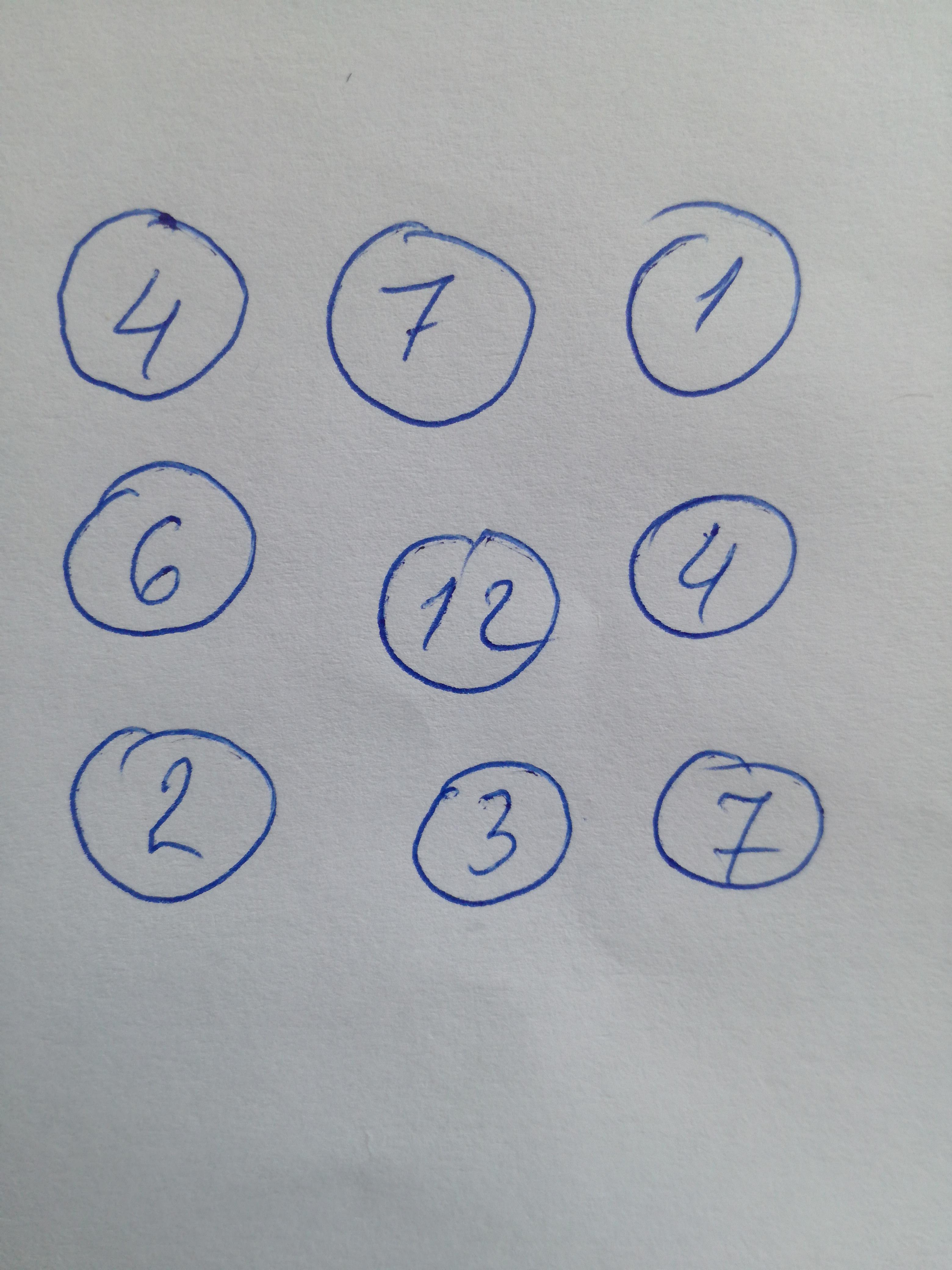 разместите в кружках числа от 1 до 8 таким образом чтобы Сумма чисел на каждой стороне квадрата была равна 12.