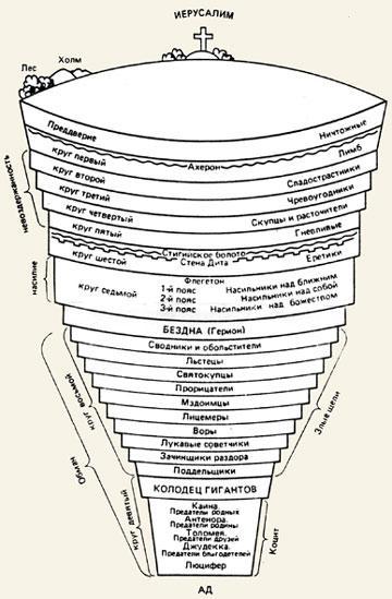 по данте устройтво божественного мира трехчастное: ад, чистилище и рай. в аду сложная структура в 9 кругов плюс разные реки. Первый круг лимб в котором содержатся праведники не познавшие истинного Бога. Далее насильники лжецы убийцы воры предатели и тп.