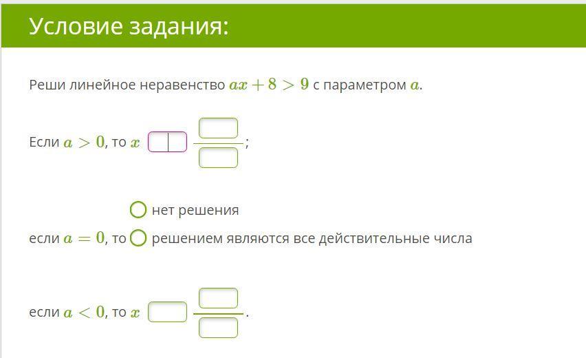 3) При а<0, x будет отрицательным => -ax>9-8 => x<1/-a. Замечу, что т.к. мы переносим отрицательный множитель через знак неравенства, то он меняется на противополжный.