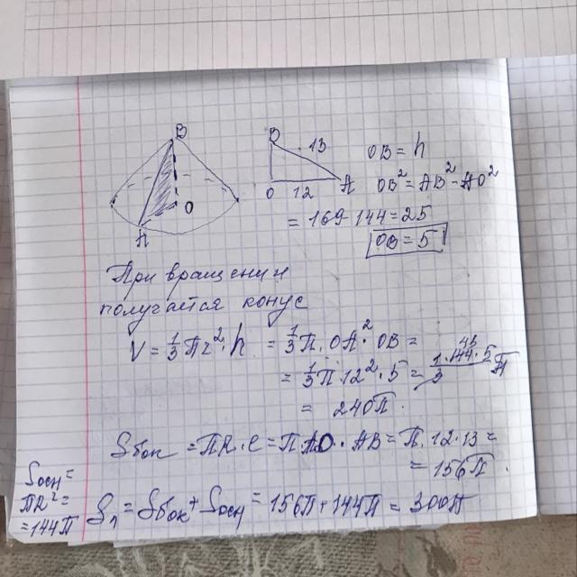8. Прямоугольный треугольник с катетом 12 см и гипотенузой 13 см оборачивают вокруг меньшего катета. 1) Найдите объем образованного тела вращения. 2) Найдите площадь боковой поверхности образованного тела вращения.