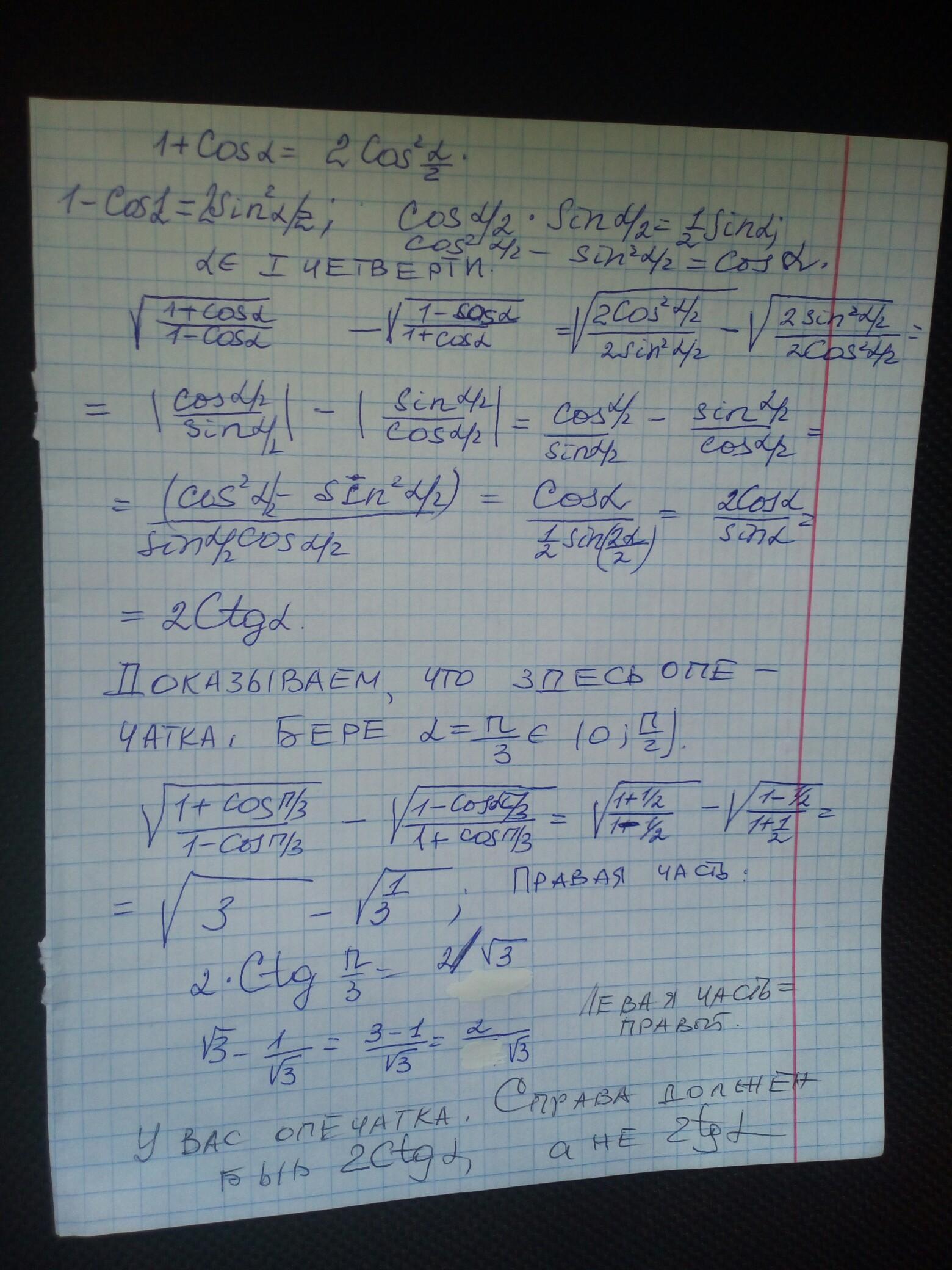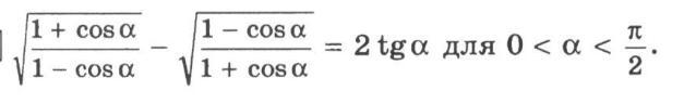 √( (1+cosα) / (1-cosα) ) - √( (1 - cosα) / (1+cosα) ) =2ctgα для 0 < α < π/2
