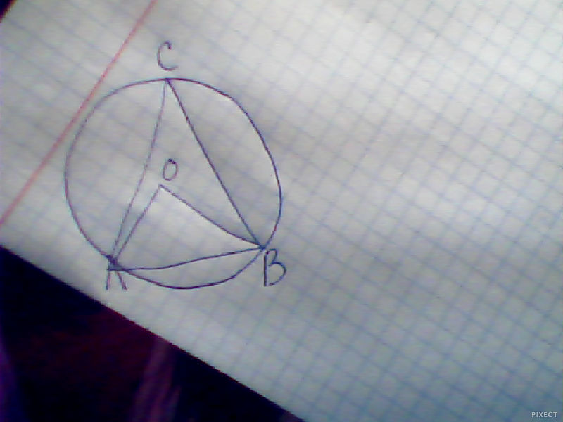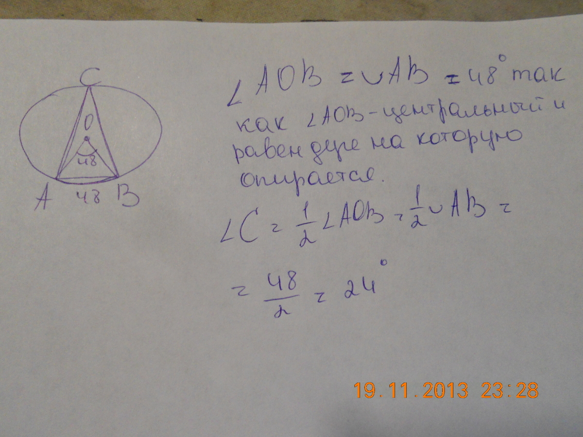 треугольник АВС вписан в окружность с центром в точке О.Найдите градусную меру углас С,если угол АОВ=48