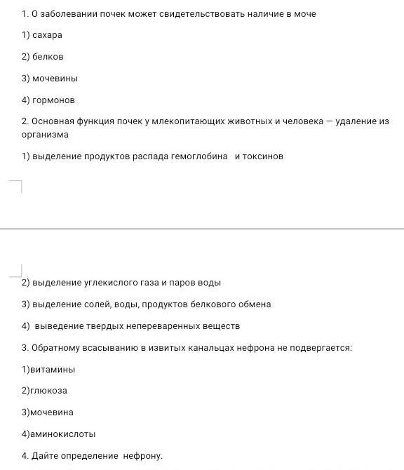 1)2 2)4 3)3 4)Нефрон (от гречечкого (нефрос)- "почка")- структурно-функциональная единица почки. Нефрон состоит из почечного тельца, где происходит фильтрация, и системы канальцев, в которых осуществляется реабсорбация