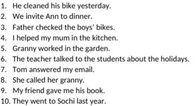 1. Did he cleane his bike yesterday? 2. Did we invite Ann to dinner? 3. Did father check the boys' bikes? 4. Did I help my mom in the kitchen?