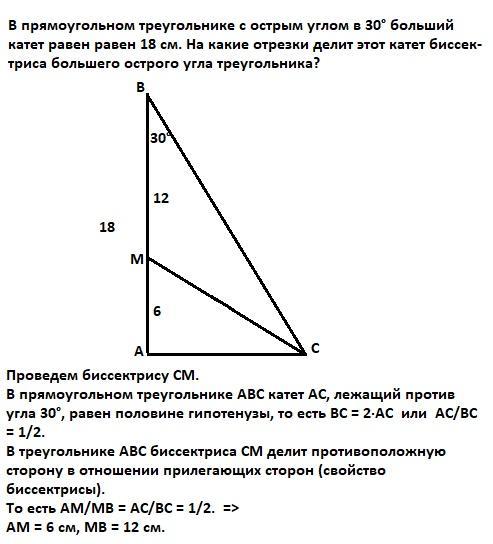 В прямоугольном треугольнике с острым углом в 30° больший катет равен равен 18 см. На какие отрезки делит этот катет биссектриса большего острого угла треугольника?